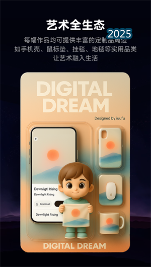 3. 一站式艺术衍生品定制与收藏功能:优夫搭建了完整的创意衍生价值链,用户可将平台上发现的任何心动艺术作品,通过集成的在线定制工具,直接转化为独一无二的周边产品,如T恤、手机壳等。这一流程涵盖了数字版权确认、产品预览和便捷的在线交易。对于限量数字藏品,优夫还提供安全的区块链存证服务,确保收藏品的唯一性与价值。这不仅是将艺术带入生活的过程,更是支持艺术家可持续发展的重要方式,形成了良性的艺术生态循环。