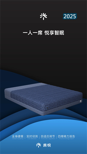 席悦App是一款专为匹配革命性的“席悦AI自适应床垫”而设计的智能睡眠健康管理应用程序。它不仅是床垫的遥控器,更是一个全方位的个人睡眠健康管理中心。该App的核心依托于床垫内置的先进硬件支持与强大的一境算法,能够对人体进行精准评估与建模,从而为用户量身定制高度个性化的睡眠解决方案。通过床垫传感器动态识别并实时侦测用户的身体压力分布、心率、呼吸率、体动等数据指标,App能够协同床垫实现24个分区的点对点全姿调节,整个过程智能、无感,在静谧中完成对用户睡姿的精准承托与适配。醒来后,用户可通过App生成的精力报告,精确衡量夜间睡眠质量,从而获得对自身睡眠健康的深刻洞悉,开启科学睡眠新纪元。