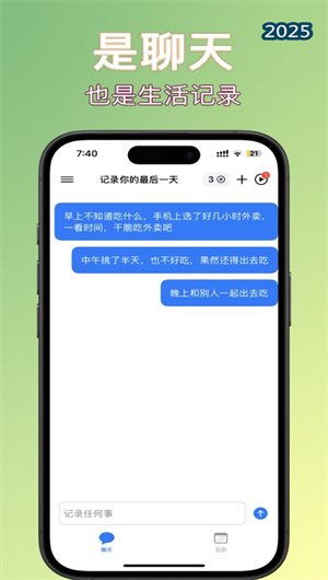 1. 聊天式日记记录:记录最后一天App采用聊天式日记记录方式,用户可以通过简单的对话界面轻松记录一天中的事件和感受。AI会自动将聊天内容整理成连贯的日记条目,确保每一段记录都清晰完整。这一功能极大地简化了日记记录流程,让用户能够更自然地表达自己,捕捉生活中的每一个细节。