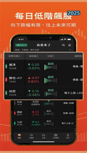 春燕來了App是一款专注于低阶飙股投资的智能选股工具,秉承“绝不追高”的原则,帮助用户在股市中寻找跌幅有限、未来可期的黑马股。通过独家设计的位阶指标和自动化选股策略,春燕來了App能够精准识别低位进场机会,并在高檔时提示风险,帮助用户实现低买高卖的投资目标。无论是新手投资者还是资深股民,这款App都能提供科学、实用的投资建议,助力用户在股市中稳健获利。
