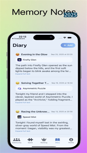 2. 个性化游戏日记与成长轨迹记录:本App提供了功能完善的游戏日记系统,玩家可为每款游戏创建独立的旅程记录,详细记载游戏进度、关键成就与个人心得。系统自动关联游戏的奖杯信息与成就系统,当玩家达成 “辉煌胜利” 或遭遇 “辛勤教训” 时,可一键记录并分享这些关键时刻。所有日记条目按时间轴可视化呈现,形成完整的个人游戏史,让成长有迹可循。
