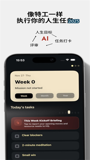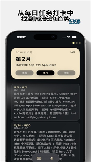 用户在应用“入职”时,即需在引导下登记其长期人生愿景,并据此拆解出明确的年度核心目标、季度关键成果与周度执行计划,形成结构化的 “年月周目标体系”。这一体系并非静态,内置的目标智能解析引擎会将宏大目标自动转化为一系列具体的、可衡量的行动任务。更重要的是,所有登记的目标会通过精美且信息丰富的 “桌面小组件” 在手机主屏常驻提醒,确保用户的人生主线任务时刻处于视觉焦点,有效对抗日常琐事的干扰,帮助用户从把握每日最小的胜利开始,稳步推进。