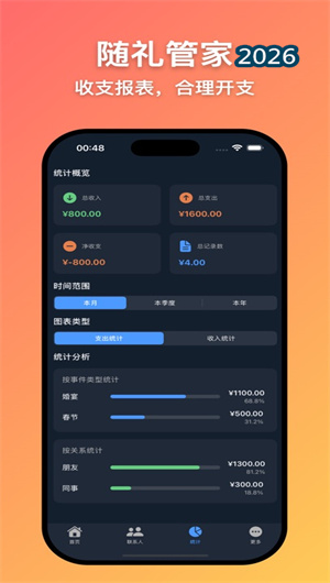 1. 数据分析平台搭载三维可视化引擎,将抽象的人情往来转化为礼金流向拓扑图、社交能量分布图、时间密度热力图等直观模型。用户可通过驾驶舱仪表盘查看月度人情收支比、社交投资回报率等23项核心指标,系统每季度自动生成社交健康度诊断报告,标记存在礼仪负债风险或情感账户失衡的关系。特别开发的场景模拟器支持对未来重要事件进行礼金预算推演,帮助用户建立科学的社交资产管理体系。