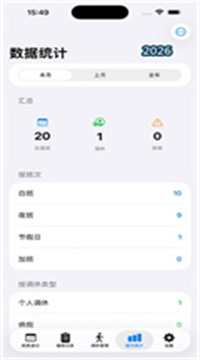 2. 勤班易记的统计汇总功能是其帮助用户看清工作付出的核心设计。系统基于每日排班记录,自动生成多维度的统计报表。月度统计展示当月各类型班次的天数分布、总工作小时数、夜班次数、周末工作天数等。年度统计以趋势图展示全年各月工作强度的变化,帮助发现工作规律。加班分析自动识别超过标准时长的班次,汇总加班总时长,区分平日加班、休息日加班、法定节假日加班(需用户预设标准)。夜班统计专门针对轮班工作者,统计夜班次数、夜班总时长、连续夜班天数等关键指标。对比功能支持任意两个时间段的数据对比,如“今年上半年与去年同期加班情况对比”。所有统计图表均可导出为图片或Excel,用于个人记录或与HR核对。这种数据可视化让无形的付出变成可见的数据。