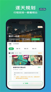 1、按天拖拽式排行程,几个城市几天自由增减,景点顺序想调就调,改完自动同步,不用在备忘录、Excel、小红书之间来回跳。