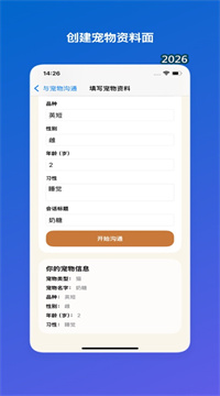 1、录入你的宠物信息。包括类型、名字、品种、性别、年龄和习惯。这些数据会定制你的聊天体验,让对话更个性化。